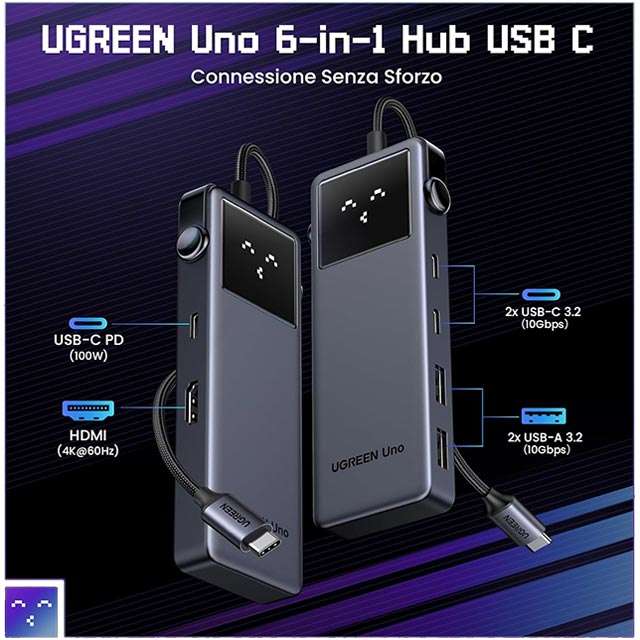 Quello che segnaliamo qui non è il solito hub USB-C 6-in-1: il modello di UGREEN non è solo dotato di numerosi slot per il collegamento dei dispositivi, ma anche di un piccolo display LED che si illumina e mostra una simpatica animazione. Perché? Perché no! Lo puoi acquistare a soli 19 euro semplicemente attivando il coupon sconto che trovi oggi su Amazon.