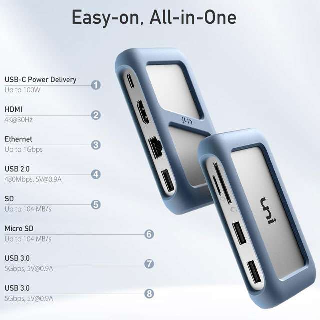 Progettato per adattarsi a ogni esigenza, l’hub USB-C 8-in-1 del marchio uni espande la connettività del laptop o tablet ed è compatibile con qualsiasi altro dispositivo dotato di slot USB-C. Oggi lo trovi in sconto a metà prezzo su Amazon. Ha un’uscita HDMI con supporto al formato 4K@30Hz per collegare monitor o TV e godersi immagini nitide e dettagliate. È l’alleato perfetto per il lavoro, lo studio o l’intrattenimento. Può contare anche sulla modalità mirroring ed estesa per migliorare la produttività su più schermi. Non manca poi la porta Ethernet da 1 Gbps per una connessione cablata stabile e veloce.