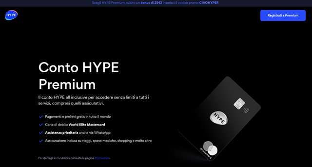 Con HYPE Premium si ha accesso ha un conto all inclusive, con copertura delle spese mediche, rimborso per l’eventuale smarrimento del bagaglio e per il ritardo del proprio volo. In più, include l’accesso esclusivo a oltre 1.000 lounge aeroportuali in tutto il mondo e il fast track gratuito negli aeroporti di Roma Fiumicino, Milano Linate, Torino, Venezia, Napoli, Catania e Olbia.