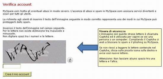“Ho già parlato con quelli di MySpace per la questione dell’immagine di sicurezza che servirebbe, secondo loro, a evitare lo spam – scrive Elena a Punto Informatico – questa è la risposta che mi è stata data”. Elena cita una mail del supporto tecnico di MySpace in cui si spiega: “Siamo veramente spiacenti della situazione. MySpace.com adotta misure per assicurare un ambiente sano e sicuro. Ti consigliamo di farti aiutare da un amico per ovviare a questo inconveniente”.