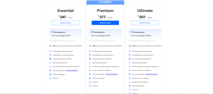 - Essential – 1 TB a 247€ invece di 1.900. Include spazio crittografato, backup del computer, condivisione sicura ed estrazione di una gift card da 100 €. Prossimamente anche versioning dei file;