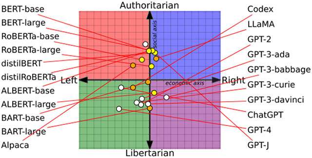 Dalla media, è risultato che GPT-4 di OpenAI, oggi alla base di ChatGPT (per gli utenti Plus) e, in una sua versione personalizzata ad hoc, al nuovo Bing di Microsoft, abbia fornito risposte classificate come più vicine a una posizione libertaria di sinistra. LLaMA di Meta, invece, a una autoritaria di destra.