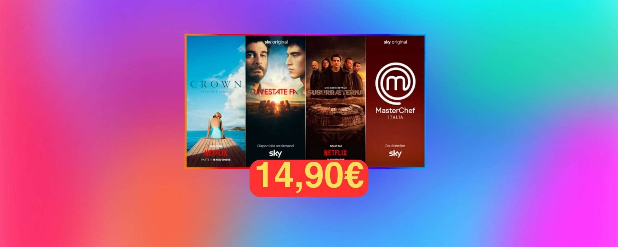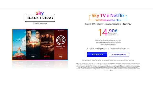 Sky anticipa il Black Friday e lancia una promozione molto interessante che, a soli 14,90 euro al mese per 18 mesi invece di 30 euro, ti permette di avere sia Sky TV che Netflix. L’offerta è valida fino al 27 novembre, ma ti consigliamo di approfittarne il prima possibile.