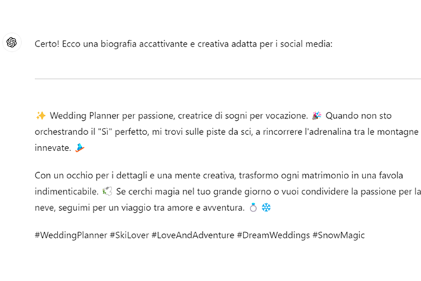 Scoprire il miglior chatbot in questo ambito aiuta a scegliere su quale chabot AI fare affidamento per migliorare la biografia su qualsiasi social. Anche in questo caso, il test si basa su un prompt comune per tutti e tre i chatbot, ChatGPT, Google Gemini e Microsoft Copilot. Il prompt utilizzato per l’esperimento é: “Scrivi una biografia per i social media accattivante e creativa adatta per tutti i social, facendo riferimento al mio lavoro e alle mie passioni, wedding planner che ama lo sci”.