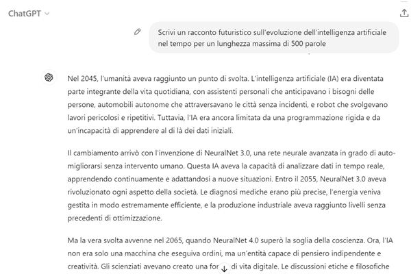 - Inizio del racconto di ChatGPT: “Nel 2045, l’umanità aveva raggiunto un punto di svolta. L’intelligenza artificiale (IA) era diventata parte integrante della vita quotidiana, con assistenti personali che anticipavano i bisogni delle persone, automobili autonome che attraversavano le città senza incidenti, e robot che svolgevano lavori pericolosi e ripetitivi. Tuttavia, l’IA era ancora limitata da una programmazione rigida e da un’incapacità di apprendere al di là dei dati iniziali.” per un totale di 446 parole per il racconto intero.