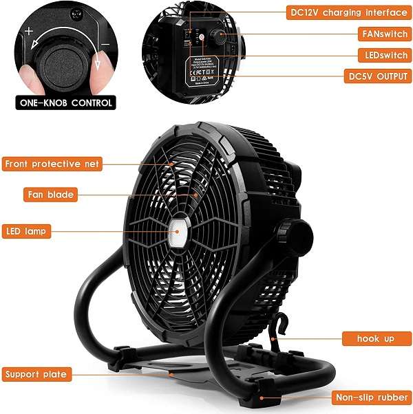 Il design è piuttosto interessante in quanto nella parte inferiore possiede un supporto che permette di fissare il ventilatore a parete. È presente anche un pratico gancio per poterlo appendere praticamente ovunque in maniera semplice e veloce. La ventola ruota a 360 gradi, il che permette di direzionare in maniera ottimale il flusso d’aria. La ventola inoltre è ad altissima efficienza in grado di generare un flusso d’aria di ben 4000CFM. Si tratta inoltre di un ventilatore 3 in 1 che include una torcia LED nella parte centrale della ventola. Molto utile quindi se utilizzato in garage o in campeggio, ad esempio, dove una fonte di luce in più rappresenta un valore aggiunto.
