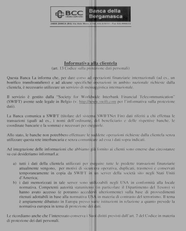 L’adozione di SWIFT, come si può leggere nella lettera qui sotto, prosegue dunque indisturbata, un ulteriore segnale della difficoltà di far sì che in Europa e in Italia le preoccupazioni dei consumatori e persino quelle dei garanti europei della privacy arrivino al centro dell’agenda politica. Le banche vanno avanti, rispettando alla lettera le leggi esistenti che permettono loro di procedere. L’unico diritto esplicitato in questi avvisi, come si può vedere, è la possibilità di ricorrere all’articolo 7 del Codice sulla Privacy , quello che consente di accedere ai propri dati.