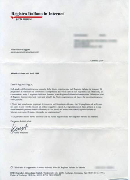 Vi mando in allegato la lettera, perché penso che vadano avvertiti tutti. Giusto un esempio: ho alcuni clienti di una certa età, che pur avendo siti internet a loro nome non conoscono nessun termine tecnico o procedura per la registrazione ecc, potrebbero tranquillamente scambiare questa lettera per una normale verifica dei dati dei loro siti (e magari firmarla senza stare troppo a leggere le cose scritte sottili, come fanno in tanti).