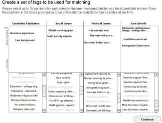 All’elettore viene chiesto di esprimere delle preferenze sui parametri più disparati che disegnano i profili dei politici. Si comincia con le caratteristiche personali del candidato: l’utente preferisce un candidato sposato? Ritiene fondamentale che abbia servito lo stato prestando servizio militare? E ancora: qual è l’atteggiamento del candidato nei confronti di questioni sociali e politiche di interesse generale? Sulla guerra in Iraq? Sulla politica delle armi? Tutte tessere di un puzzle che con il mouse si possono trascinare all’interno di una tabella che va a disegnare una mappa della posizione politica dell’elettore .