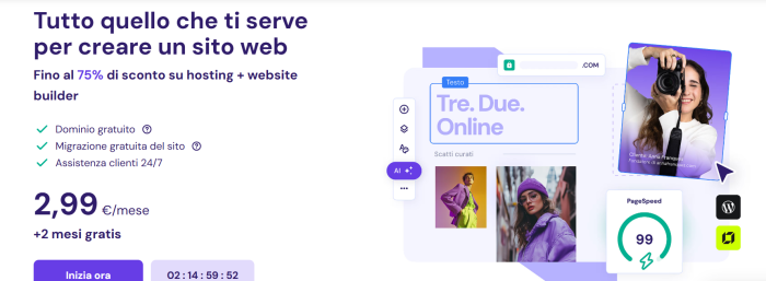 Con l’attuale promozione sul sito ufficiale, è possibile partire subito con un hosting professionale a soli 2,99€ al mese, senza rischi grazie alla garanzia di rimborso di 30 giorni. Un’occasione ideale per lanciare un nuovo sito personale, aziendale o e-commerce con strumenti avanzati come l’AI e costi ridotti.