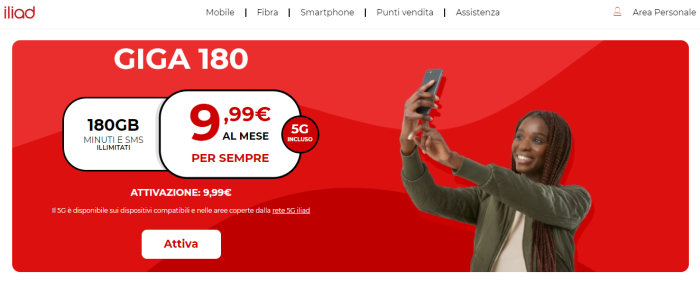 Iliad propone un piano da 9,99€ al mese che offre un pacchetto completo con 180GB di traffico dati in 4G/4G+ e 5G. Con un’infrastruttura avanzata e zero costi nascosti, l’offerta Iliad Giga 180 è perfetta per chi desidera un piano chiaro e conveniente. Con molti altri vantaggi, come ad esempio chiamate ed SMS illimitati. Inoltre, il prezzo è bloccato nel tempo, senza aumenti imprevisti. Ma andiamo a scoprire nel dettaglio la promo in questione.