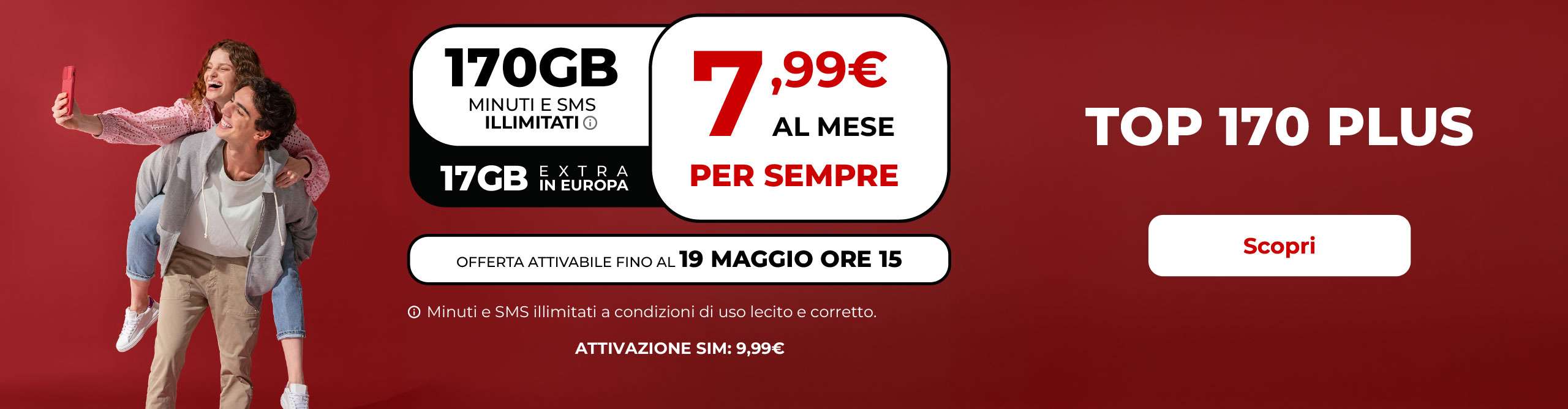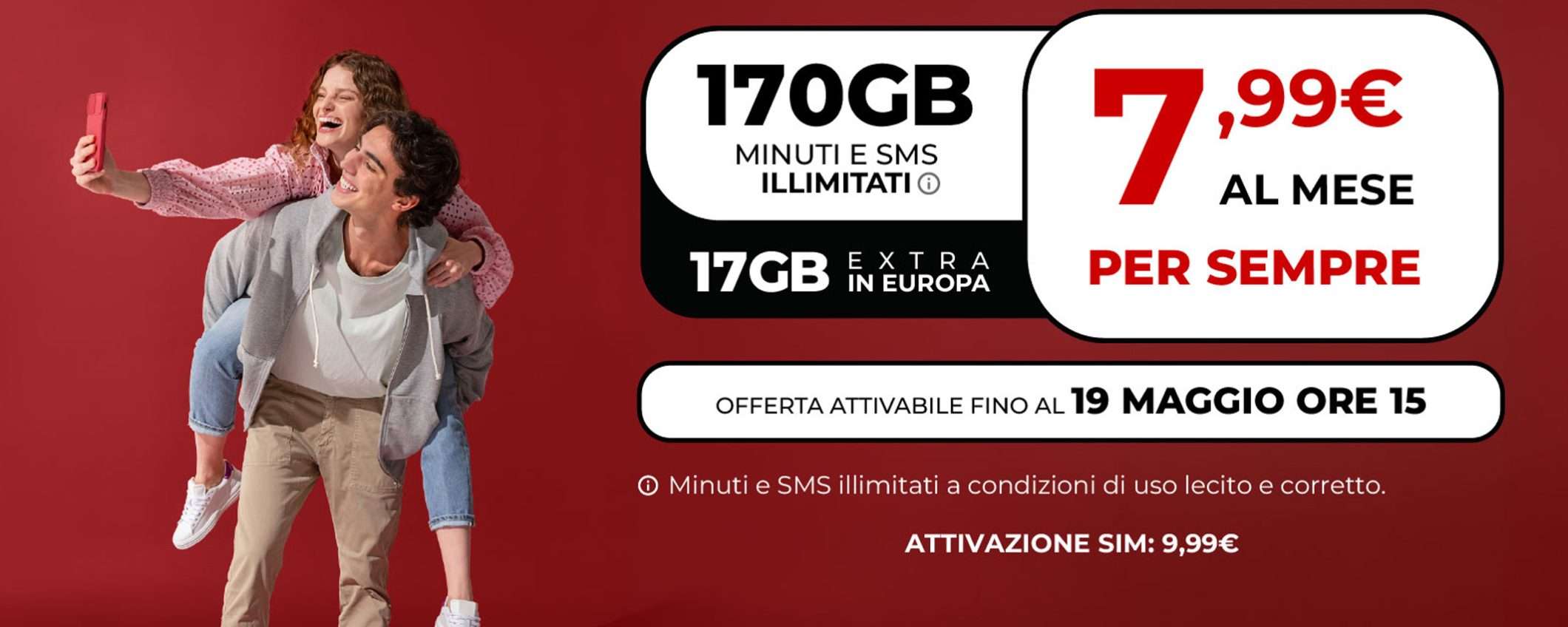 In vista dell’estate, questa nuova promozione Iliad diventa praticamente essenziale: TOP 170 PLUS propone, a soli 7,99 euro al mese, 170 GB, minuti e SMS illimitati, più 17 GB extra da utilizzare in Europa. Puoi attivare la promo online entro il 19 maggio.