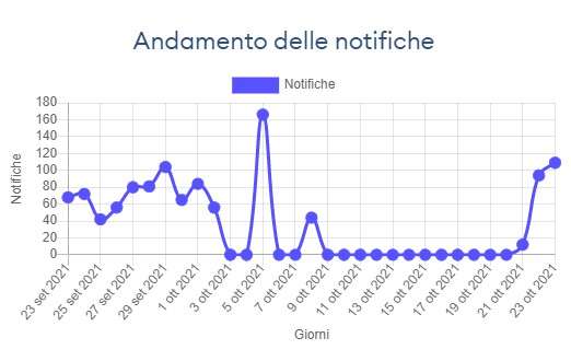 Se è presumibile il fatto che buona parte delle ultime installazioni possa avere il Bluetooth attivo e possa utilizzare Immuni sia per il Green Pass che per il tracciamento, allora è facile immaginare che almeno 2-4 milioni di utenti possano essere attualmente attivi nel processo di tracciamento della pandemia. Tutto ciò avviene in un momento di contagi bassi e sotto controllo, ma in piccolo aumento su scala nazionale: questo si riflette su Immuni con 11 giorni consecutivi di zero notifiche, seguito da un nuovo picco che ha riportato l’attività alla situazione iniziale.