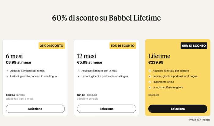 Se con i primi due hai l’accesso completo a lezioni in-app, videolezioni in diretta, giochi e podcast nella lingua scelta, il vero vantaggio lo hai con il Lifetime. Grazie al quale poter imparare tutte le lingue che vuoi fino a quando lo vorrai, con un pagamento unico per l’offerta migliore che puoi trovare. Di norma costerebbe 599,99 euro, dunque vai a pagarlo 360 euro in meno!