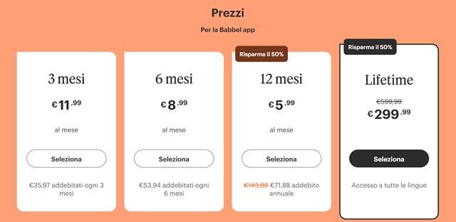 La prima lezione di Babbel è gratuita. Inoltre, una volta completato l’acquisto del piano a vita, si ha una garanzia di rimborso completo di 20 giorni qualora il servizio non soddisfi appieno le proprie aspettative iniziali.