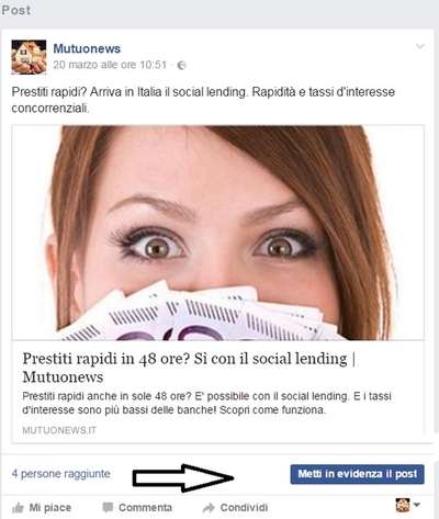 1. Entrare nella pagina gestita, identificare il post che si vuole diffondere a pagamento e cliccare su Metti in evidenza il post ;
