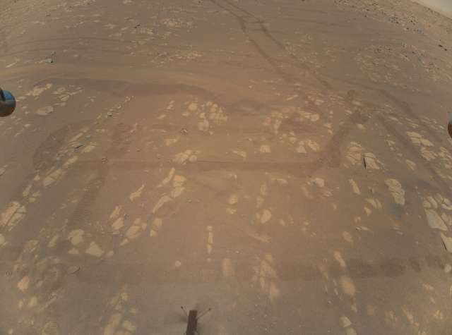 La NASA ha programmato una serie di test (almeno cinque) con difficoltà crescente. Durante il secondo volo, Ingenuity ha raggiunto un’altezza di 5,2 metri ed effettuato uno spostamento laterale di 2 metri. Ha quindi eseguito tre rotazioni per un totale di 276 gradi ed è ritornato al punto di partenza. Nella foto scattata con la fotocamera frontale da 13 megapixel si vedono le tracce lasciate dal rover (fuori inquadratura in alto), l’ombra dell’elicottero (in basso), parti dei due supporti del drone (destra e sinistra) e una porzione dell’orizzonte marziano (in alto a destra).