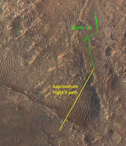 Nell’immagine si può vedere il percorso del nono volo. Nei prossimi giorni arriveranno le immagini a colori della regione Seitah e della zona chiamata Raised Ridges che verrà visitata dal rover. Queste sono invece le posizioni attuali di Ingenuity e Perseverance: