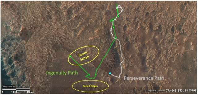 Ingenuity e Perseverance hanno condiviso la parte iniziale del viaggio, ma successivamente l’elicottero ha avuto il compito di effettuare voli di ricognizione per scoprire eventuali ostacoli che il rover non può superare. Dopo aver fotografato l’area denominata Raised Ridges, dove si trova ora il rover, Ingenuity ha sorvolato la regione South Seitah, indicata sulla mappa.