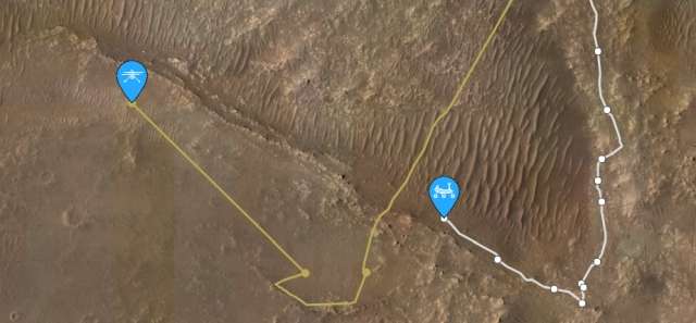 Utilizzando il suo sistema di navigazione autonomo, Perseverance si muove infatti verso nordovest lungo la cresta meridionale di Seitah e incontrerà l’elicottero nei prossimi giorni. Queste sono le loro posizioni attuali: