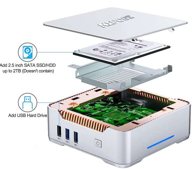 Il computer propone uno chassis completamente in metallo con un coperchio a slitta che consente l’upgrade della memoria. Questo, infatti, da l’accesso al vano in cui installare un secondo disco HDD/SSD da 2,5 pollici. Lo spazio di archiviazione, infatti, si limita a 128GB accompagnati da 8GB di memoria RAM. Il cuore del computer è rappresentato, come intuibile dal nome, da un Intel Celeron J4125 quad-core con una frequenza massima di 2,7GHz. La CPU è già inserita nell’elenco di compatibilità rilasciato da Microsoft, il che consente di effettuare l’aggiornamento a Windows 11 in maniera del tutto gratuita. Si tratta di una configurazione senza enormi pretese chiaramente, ma perfetta per l’attività d’ufficio. Gestisce perfettamente l’intero pacchetto Office per l’elaborazione dei documenti, così come la navigazione o l’intrattenimento. Un’ottima soluzione come media center che unisce l’utilità del computer desktop al relax delle piattaforme di streaming come Prime Video, Netflix o Disney+.