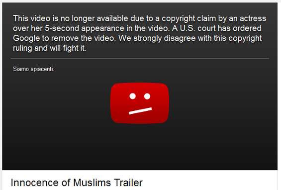 Garcia nel mese di febbraio si era vista riconoscere la rimozione del video da YouTube: era riuscita nel proprio intento convincendo il tribunale del fatto che il video che contiene la sua brevissima interpretazione ledesse i diritti d’autore legati alla sua performance. Google aveva tentato di combattere : aveva sottolineato non solo l’anomalia dell’interpretazione basata sul diritto d’autore e il fatto che il tribunale, nel nome del copyright, avesse calpestato la libertà dei netizen di informarsi su un tema che tanto ha fatto discutere, ma aveva messo in discussione anche le modalità dell’ordine di rimozione. A Google era stata imposta la cancellazione di tutte le copie del video da tutte le piattaforme di cui è responsabile , a partire dai link esemplificati dall’attrice per arrivare a rimuovere tutte le altre numerose occorrenze caricate in Rete dagli utenti. Senza dimenticare di “adottare misure ragionevoli per impedirne i caricamenti futuri”.