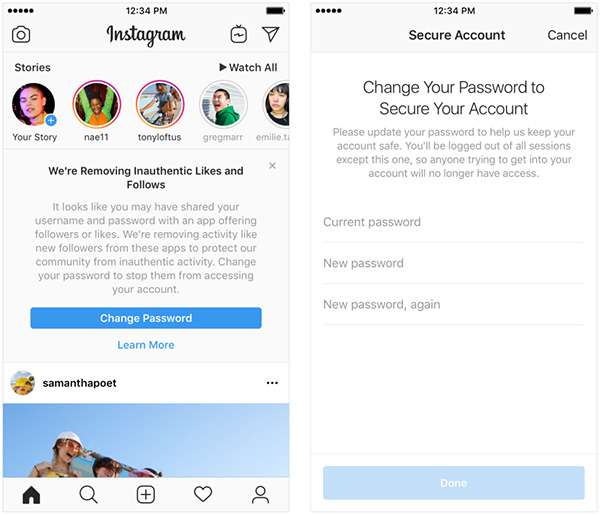 Instagram sconsiglia inoltre fortemente di cedere a terzi le proprie credenziali di accesso alla piattaforma, poiché username e password potrebbero essere impiegati per altre finalità da eventuali malintenzionati. Agli interessati verrà mostrato un avviso che invita a cambiare il codice segreto per il login.