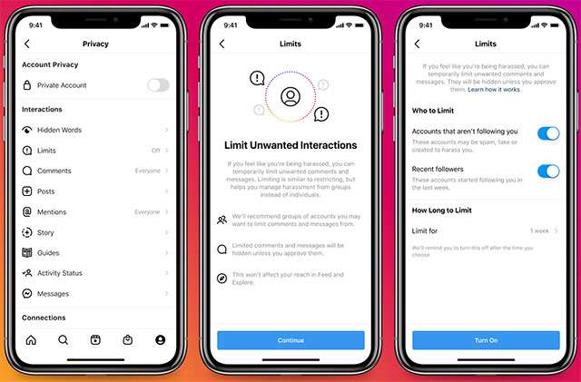 La prima novità è rappresentata dal lancio in tutto il mondo di Limiti, una caratteristica facile da attivare che nasconde automaticamente i commenti e le richieste nei DM di persone che non seguono il proprio account o lo fanno da poco. Risulta particolarmente utile per i personaggi pubblici. È poi prevista la comparsa di notifiche più severe per coloro che cercano di pubblicare commenti potenzialmente offensivi. Infine, si segnala il debutto globale di Hidden Words (opt-in, va abilitata), funzione che filtra automaticamente i commenti offensivi ricevuti via DM in una cartella nascosta, così da non vederli.