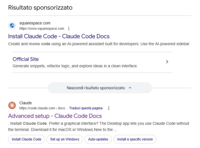 La tecnica usata per ingannare gli utenti è il tradizionale malvertising. Quando viene inserita la query “install claude code” o simili, Google mostra in prima posizione un link sponsorizzato che punta al sito fasullo di Claude Code dedicato agli sviluppatori. Il sito legittimo è quello in seconda posizione, come si può vedere nello screenshot.