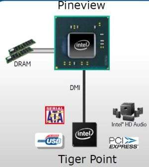 Intel ha confermato che Pine Trail sarà composta da Pineview , una CPU Atom con grafica e controller di memoria integrati , e da Tiger Point , un hub per l’I/O. Il design del futuro Atom è di tipo system-on-chip (SoC), e seppure non arrivi al livello di integrazione dei tipici SoC per smartphone, riduce il numero dei chip dai tre attuali (CPU, northbridge 945GC/GSE e hub ICH7/ICH7M) a due (Pineview e Tiger Point), riducendo così anche la dimensione del package, il costo dei materiali e, soprattutto, il consumo energetico: sebbene il thermal design power di questa soluzione non sia ancora stato reso noto, alcune fonti sostengono che Pineview consumi soltanto 2 watt contro i quasi 13 watt dell’accoppiata Atom serie N e chipset 945GSE.