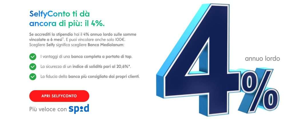 Banca Mediolanum propone una delle offerte più vantaggiose del momento per il settore dei conti correnti: per tutti i nuovi clienti che scelgono SelfyConto, infatti, c’è la possibilità di accedere ad interessi al 4%, sulle somme vincolate a 6 mesi, e di poter contare su di un conto corrente a zero spese e con tanti servizi accessori da aggiungere in base alle proprie esigenze. Il conto proposto da Banca Mediolanum può essere aperto in pochi click, tramite SPID. La promo, però, sta per scadere. C’è tempo fino al 28 febbraio per poter beneficiare dell’offerta. Per tutti i dettagli c’è il link qui di sotto.