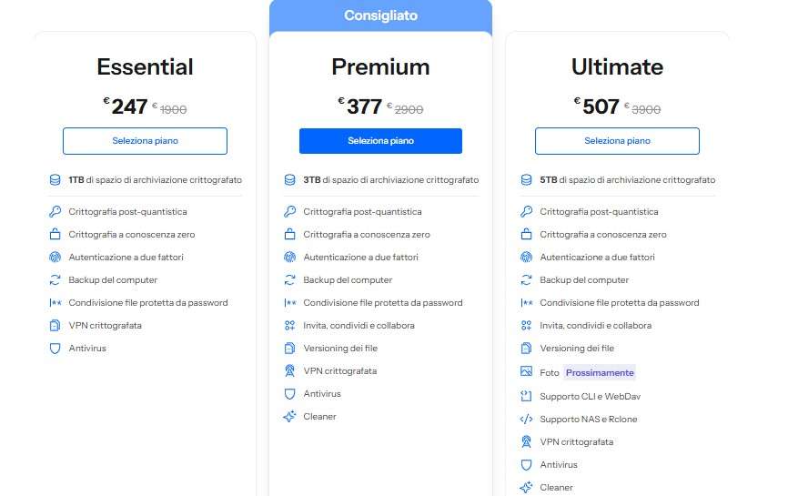 Acquistando un piano qualsiasi avrai tutto questo e anche una suite di sicurezza completa che comprende il backup automatico del computer, una VPN crittografata e un Antivirus. Qualcosa di più invece se scegli i piani Premium e Ultimate che aggiungono uno strumento Cleaner, il versioning dei file (per recuperare versioni precedenti) e opzioni per invitare, condividere e collaborare.