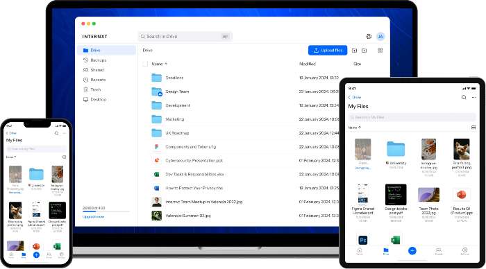 Lo spazio per salvare i nostri documenti e altri file importanti in un luogo sicuro non è mai abbastanza. Un servizio di cloud storage come Internxt Drive ci viene incontro fornendoci tutto ciò che serve per tenere al sicuro i nostri dati e proteggere al tempo stesso la nostra privacy. Internxt Drive consente infatti di archiviare i file in maniera sicura e veloce tramite la sua app di archiviazione cloud. I documenti e gli altri contenuti sono accessibili in qualsiasi momento dal computer, dallo smartphone, dal tablet e da qualunque dispositivo disponga di una connessione a Internet. Il tutto avviene nella massima sicurezza, poiché Internxt utilizza una crittografia di livello militare per evitare accessi non desiderati da parte di cybercriminali.