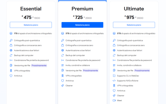 I piani Lifetime attualmente disponibili sono tre: Essential con 1 TB a 247€ invece di 1.900€, Premium con 3 TB a 377€ invece di 2.900€ e Ultimate con 5 TB a 507€ invece di 3.900€ – tutti con uno sconto fino all’87% sul prezzo di listino.Un pagamento unico, nessun rinnovo mensile, nessuna email di “il tuo piano scade tra 3 giorni”. Dentro ogni piano trovi app per Windows, macOS, Linux, iOS e Android, backup automatico, condivisione protetta da password, VPN integrata, antivirus e strumenti di ottimizzazione. Tutto sincronizzato in tempo reale su tutti i tuoi dispositivi. L’acquisto è protetto da 30 giorni di garanzia soddisfatti o rimborsati, con la possibilità di suddividere il pagamento in tre rate senza interessi. E per chi vuole testare prima di impegnarsi, c’è anche un piano gratuito con 1 GB di spazio crittografato – gratis, per sempre.