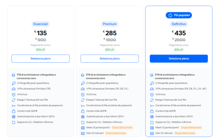 Cosa significa, in poche parole? Significa che pagherai una sola volta per avere per sempre un piano di archiviazione personalizzato per foto, video, documenti e non solo, con un prezzo che crolla dell’85% per un vantaggio mai registrato prima d’ora. Un esempio? Scegliendo il piano più popolare fra gli utenti, ovvero il piano Definitivo, pagherai solamente 435€ (al posto delle canoniche 2900€) per 5TB di archiviazione crittografata a conoscenza zero!