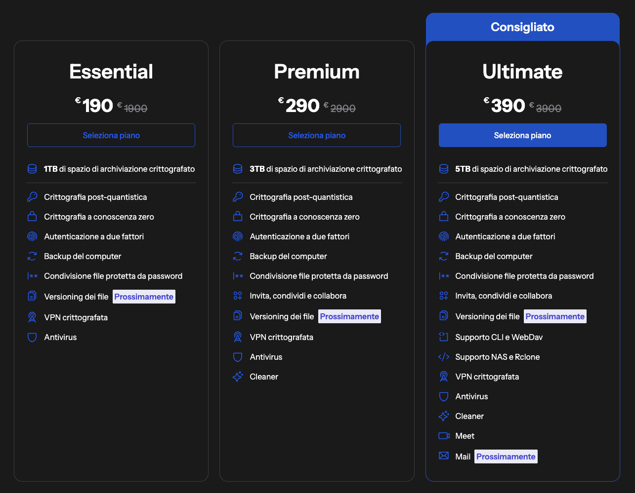 - Ultimate, scontato a 390 € dai 3.900 € iniziali, integra 5 TB di archiviazione, supporto CLI e WebDAV, Rclone e NAS, VPN crittografata, Meet, Mail e strumenti avanzati come antivirus e monitoraggio del dark web.
