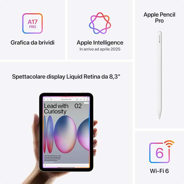 Basato ovviamente sul sistema operativo iPadOS, ha in dotazione il display Liquid Retina da 8,3 pollici in alta risoluzione (è compatibile con il pennino Pencil Pro). Il cuore pulsante di ultima generazione integra CPU, GPU e Neural Engine, per assicurare un’esperienza ottimale in ogni ambito. Ci sono poi due fotocamere da 12 megapixel (una anteriore e l’altra posteriore), la connettività Wi-Fi 6E e Bluetooth 5.3, senza dimenticare la batteria con un giorno di autonomia. Dai uno sguardo alla pagina dedicata per conoscere tutti gli altri dettagli.