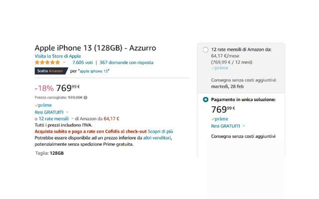 Su Amazon continuano le super offerte. Inizia la settimana con un risparmio pazzesco. Acquista Apple iPhone 13 128GB a soli 769 euro, invece di 939 euro. Grazie a questa promozione, che trovi solo sullo store del colosso dello shopping online, stai salvando 170 euro.