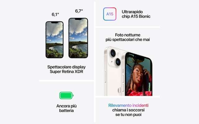 Dotato di 128GB di ROM, questo smartphone iOS offre tutto lo spazio necessario per installare app e giochi. Inoltre, il processore A15 Bionic garantisce massime prestazioni ed estrema fluidità di utilizzo, anche in multitasking. Il tutto su un ottimo display Super Retina XDR da 6,1 pollici, ricco di colori e di dettagli e con una luminosità spettacolare, anche sotto la luce diretta del sole.