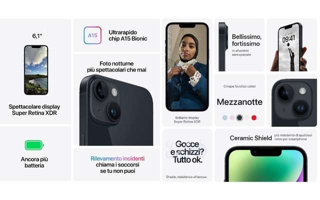 Acquista l’ottimo Apple iPhone 14 128GB se vuoi uno smartphone potente, versatile e longevo. Non avrai più problemi di sicurezza né prestazioni perché sei sicuro che gli aggiornamenti arriveranno puntuali. Inoltre, grazie al processore A15 Bionic tutto diventa più rapido. Qualsiasi app e gioco avvii funziona alla perfezione, anche i più impegnativi. Il display Super Retina XDR da 6,1 pollici è uno spettacolo. Colori audaci, dettagli perfetti e luminosità pazzesca sono solo alcuni degli elementi vincenti.