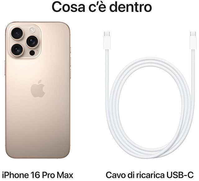 Ha in dotazione il display Super Retina XDR da 6,9 pollici con risoluzione 2868×1320 pixel, il processore A18 Pro realizzato internamente con CPU 6-core, GPU 6-core e Neural Engine 16-core, un sistema di fotocamere Pro con sensore principale Fusion da 48 megapixel, Face ID, Apple Pay, connettività 5G, Wi-Fi 7 e Bluetooth 5.3, GPS, NFC e batteria con autonomia elevata. Dai uno sguardo alla scheda completa per tutti gli altri dettagli a proposito di specifiche tecniche integrate, design in titanio e funzionalità in dotazione.