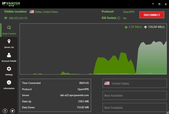 IPVanish garantisce la privacy durante la navigazione con oltre 40.000 indirizzi IP di oltre 1.600 server posizionati in oltre 75 paesi. L’utente può scegliere il server migliore (ovvero il più veloce), sfruttando la specifica funzionalità presente nelle applicazioni. In alternativa è possibile la scelta manuale.