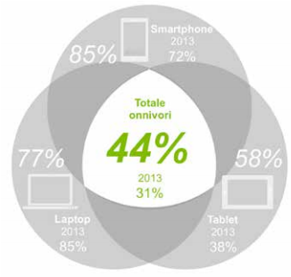 A tal proposito, i numeri registrati quest’anno hanno fatto parlare nel nostro paese di “onnivori digitali”, definizione che inquadrerebbe tutti coloro che possiedono contemporaneamente un portatile, un tablet e uno smartphone: si tratta insomma di una definizione che assume come punto di vista non il cosa viene consumato, ma il come .