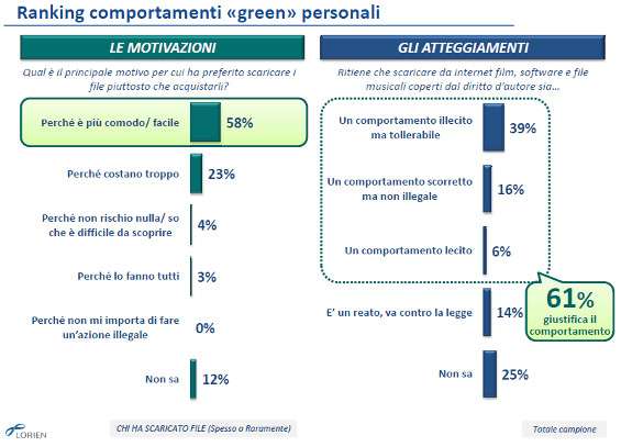 Coloro che ammettono di scaricare materiale protetto da diritto d’autore, molti dei quali confortati dalla presunta liceità del proprio comportamento, offrono motivazioni significative a favore del mercato: attingere alle risorse condivise illecitamente in rete è più comodo e più facile rispetto alle proposte del mercato legale (58 per cento) e non costringe a farsi carico di spese ritenute eccessive per ricompensare gli autori (23 per cento).