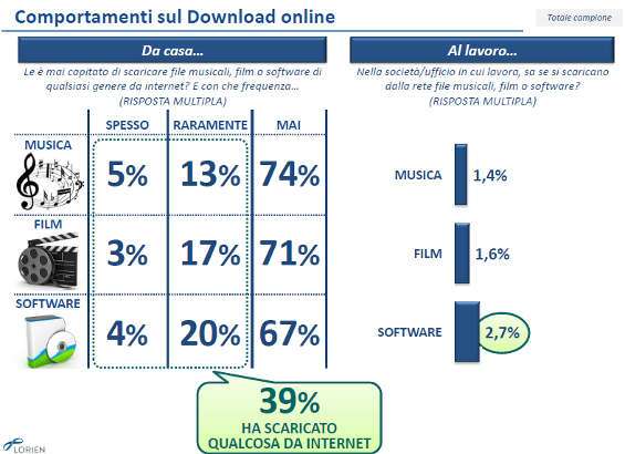 Tra i contenuti che gli intervistati ammettono di essersi procurati a mezzo download da fonti non ufficiali, il software si caratterizza per una maggiore attività illecita sul posto di lavoro : a fronte di musica e film, probabilmente percepiti come afferenti alla sfera dell’intrattenimento privato e quindi ottenuti con la mediazione delle connessioni domestiche, il 2,7 per cento degli intervistati ha dichiarato che “nella società/ufficio in cui lavora, si scaricano dalla rete software”.