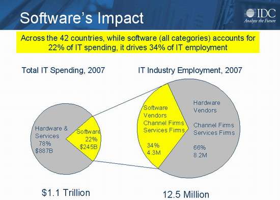 Ma la novità forse più interessante dello studio è che nei numeri sia considerato anche l’open source . A differenza di quanto accaduto in passato, infatti, e con l’idea di dare un quadro il più possibile complessivo del mercato del “software legale”, IDC ha non solo considerato la vendita di software open source come vendita di software a costi ridotti o costo zero, ma ha anche valutato l’indotto occupazionale, economico e fiscale dei servizi e che l’adozione delle piattaforme libere può provocare.