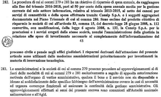 In esso si legge infatti che l’obiettivo è quello di un “risparmio di spesa annuale, da raggiungere alla fine del triennio 2016-2018, pari al 50 per cento della spesa annuale media per la gestione corrente del solo settore informatico, relativa al triennio 2013-2015, al netto dei canoni per servizi di connettività effettuata tramite Consip SpA o i soggetti aggregatori documentata nel Piano Triennale”. A poter fare eccezione da questa previsione di risparmio la Consip stessa e l’amministrazione della giustizia in relazione alle spese di investimento necessarie al completamento dell’informazione del processo civile e penale negli uffici giudiziari.