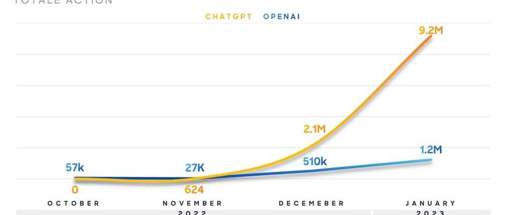 Parallelamente, la crescita del chatbot è stata esponenziale: se nel novembre 2022 si contavano 624 action circa in Italia, a dicembre si è passati immediatamente a 2,1 milioni, mentre nel mese di gennaio 2023 si è saliti a quota 9,2 milioni. Cosa si intende con “Action”? Condivisioni di screenshot, immagini e post riguardanti ChatGPT sui principali social network, ovvero Facebook, Instagram, Twitter, TikTok e YouTube, ma anche i semplici commenti, like, retweet e salvataggi dei contenuti tra i preferiti.