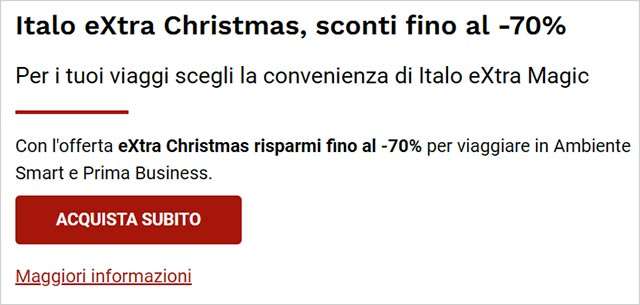 Stai programmando le tue vacanze di Natale? È il momento giusto per farlo: non lasciarti sfuggire la promozione eXtra Christmas di Italo eXtra Magic in corso. Ti permette di risparmiare con sconti fino al 70% sui biglietti per viaggiare in Ambiente Smart e Prima Business. Attenzione: è disponibile per un numero di posti limitato, ti consigliamo di non perdere tempo.