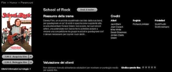 Ma come sono nella pratica le due diverse offerte? Le abbiamo provate con il noleggio alla maggiore qualità disponibile del medesimo film (il già cult School Of Rock ). Il buono dell’offerta di Apple sta in un download abbastanza rapido (considerata la mole) e nella portabilità effettiva del file che, una volta scaricato, può finire su iPhone, iPod, iPad e via dicendo (ma attenzione, in caso di noleggio la riproduzione è subordinata alla presenza di una connessione ad internet che verifichi che non siano scaduti i 30 giorni dall’acquisto o le 48 ore dalla prima visione). Il cattivo sta nella qualità, per il momento solo DVD (ma il fastidio si nota solo su televisori HD) e nella difficoltà di vedere il film in TV. Per farlo infatti o si è provveduto a connettere computer a schermo, o si possiede una AppleTv comprata negli USA, o si attende (ancora poco?) che questa esca sul mercato italiano.